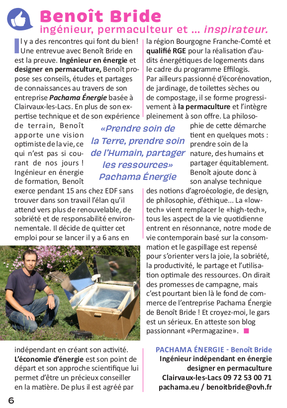 - Et depuis 2015, expérimentations de solutions Low-tech et/ou permaculturelles, audits énergétiques de maisons individuelles, aide à la création de lieux autonomes et sobres...